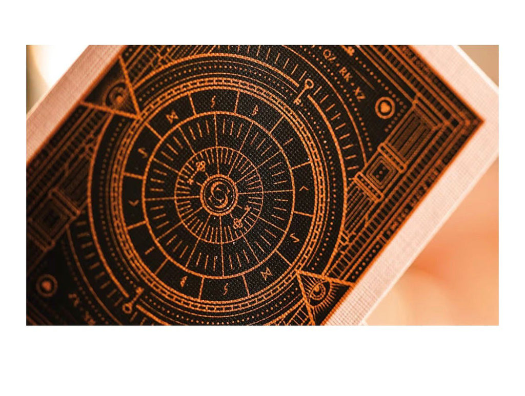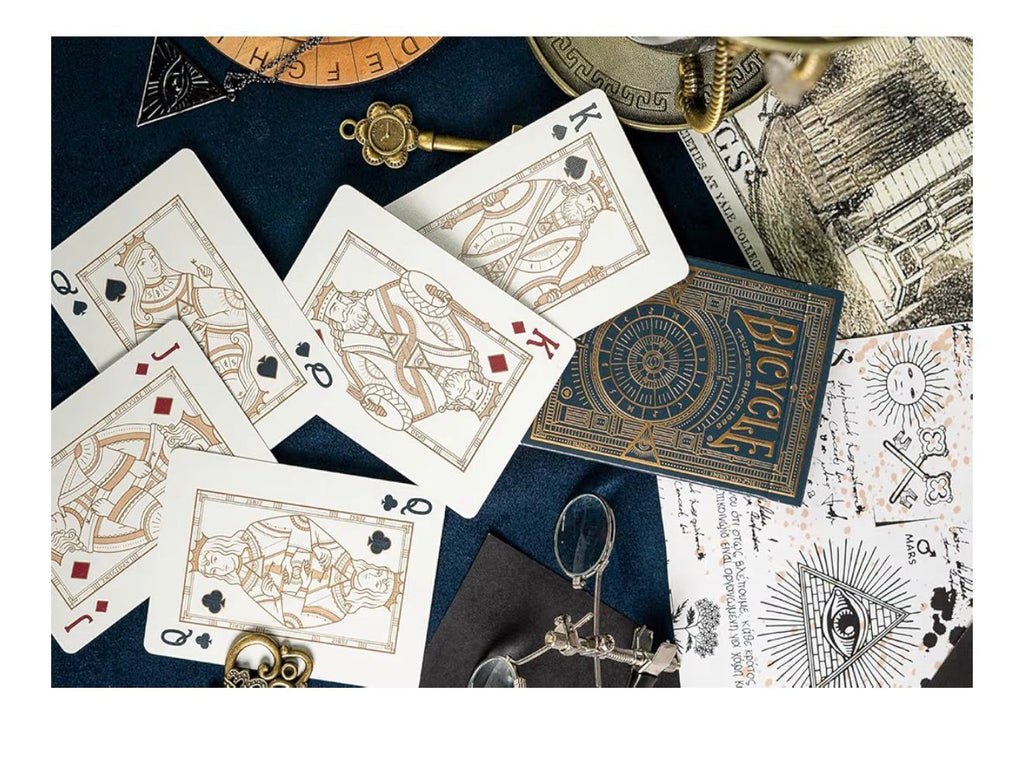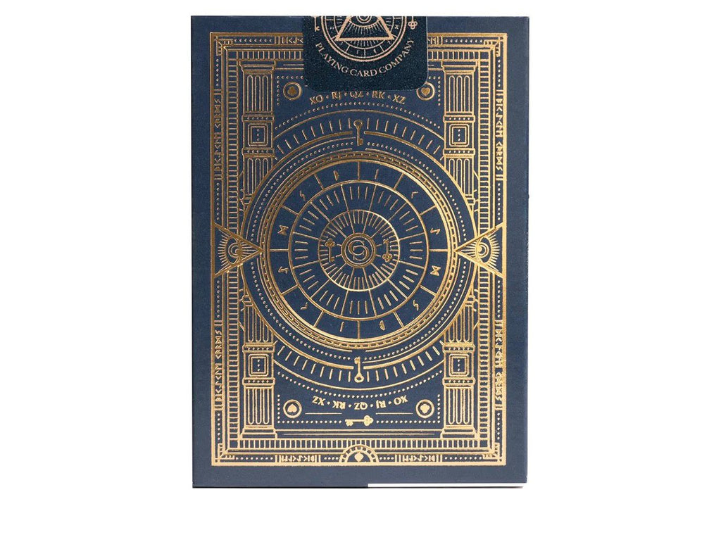 Este baralho luxuoso possui um estojo (tuck case) em azul-escuro sofisticado, com o interior estampado em um elegante padrão de chaves. A arte externa conta com linhas intrincadas em hot stamping com acabamento em foil dourado, além de detalhes em relevo (embossing) que elevam o nível de sofisticação.