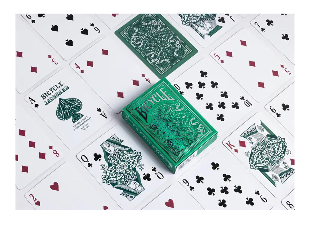 O Bicycle® Jacquard celebra a beleza dos tradicionais padrões têxteis jacquard, trazendo para cada carta um design sofisticado, ornamental e rico em detalhes. Inspirado em tecidos clássicos usados em alfaiataria e decoração, este baralho combina tradição e luxo em um visual único.